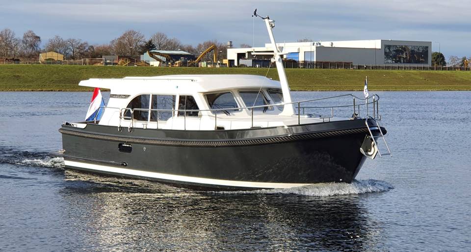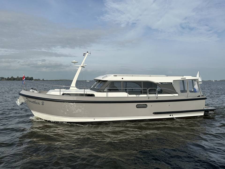 A charming Linssen Yacht of the Grand Sturdy 35.0 sedan type. With its low headroom (2.37 m), this type of yacht is suitable for many beautiful cruising routes. This Linssen yacht is powered by a Volvo D2 diesel. Features a bow and stern thruster, tridata, plotter, rudder positioner. There is a surprising amount of space on this compact yacht. The forward cabin has a cosy captain's cabin with a double bed, bathroom and electric toilet and washbasin and a separate wet room with a shower. On the starboard side is the steering position and dashboard. Above the kitchen and steering position is a ship-wide sliding roof, emphasising the outdoor feel. The kitchen is on the port side and fully equipped including a cooker and a generous fridge. In the aft section is the saloon with a generous sofa with plenty of storage space, which can be pulled out into a comfortable double bed in one operation. There is also a moveable dining table. There is plenty of cupboard space in the saloon. The saloon is equipped with folding doors giving access to the open cockpit, where there is a generous bench seat. This cockpit is lockable and heatable.