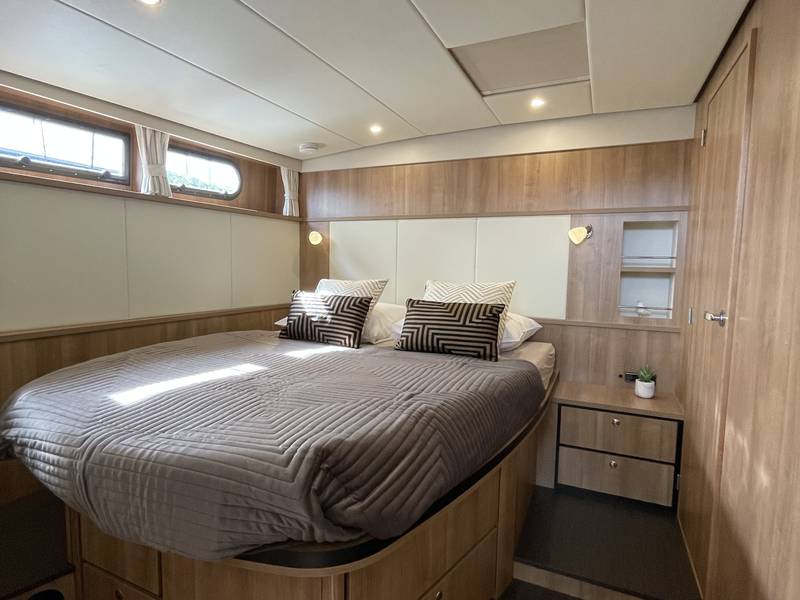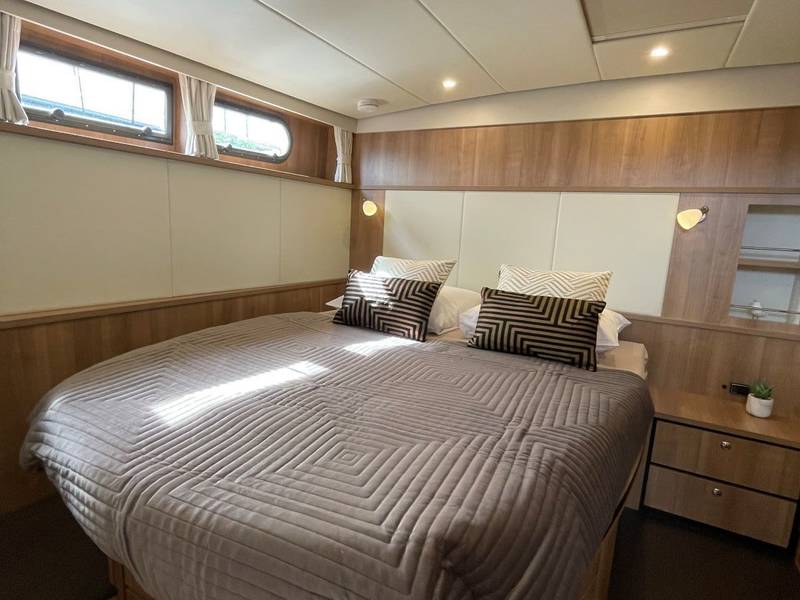 The Linssen GS 40.0 SL AC is a spacious yacht with two equal-sized cabins, each with a double bed, two bathrooms and two electric toilets.