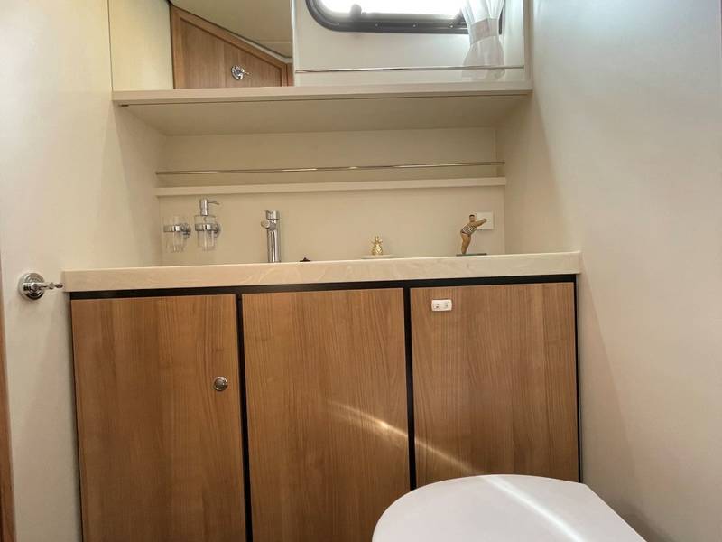 The interior is characterised by a sophisticated layout made from fresh, light materials, such as Corian tops and leather in a light, tasteful colour scheme. Opposite the kitchen is a beautiful dining area (dinette) with lots of light. A Nespresso coffee machine is available on board.