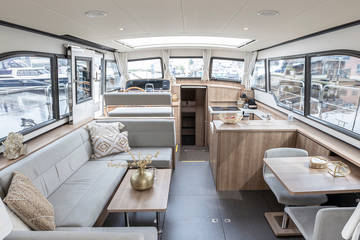 In the saloon, the Easy Sleep System allows an additional double bed to be created with ease. This means up to six guests can stay overnight on board, without compromising daytime living space. The saloon remains a pleasant place to relax together, read a book or enjoy the view over the water.