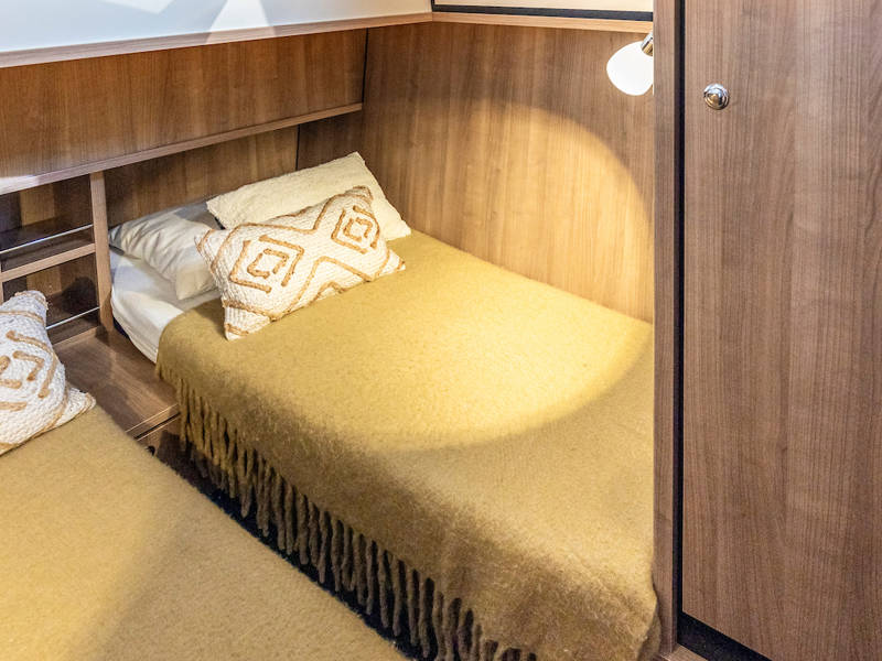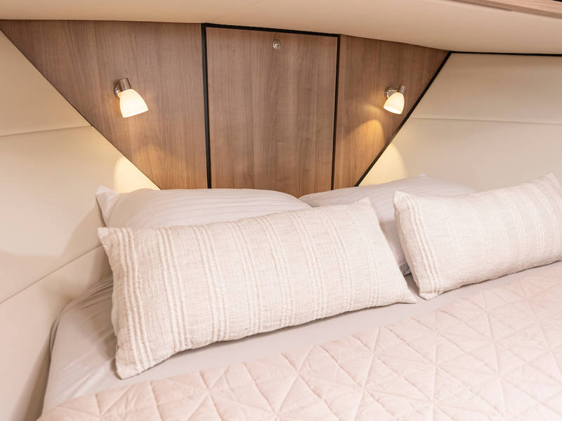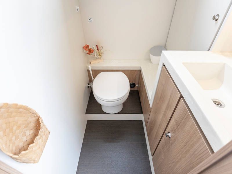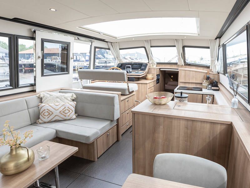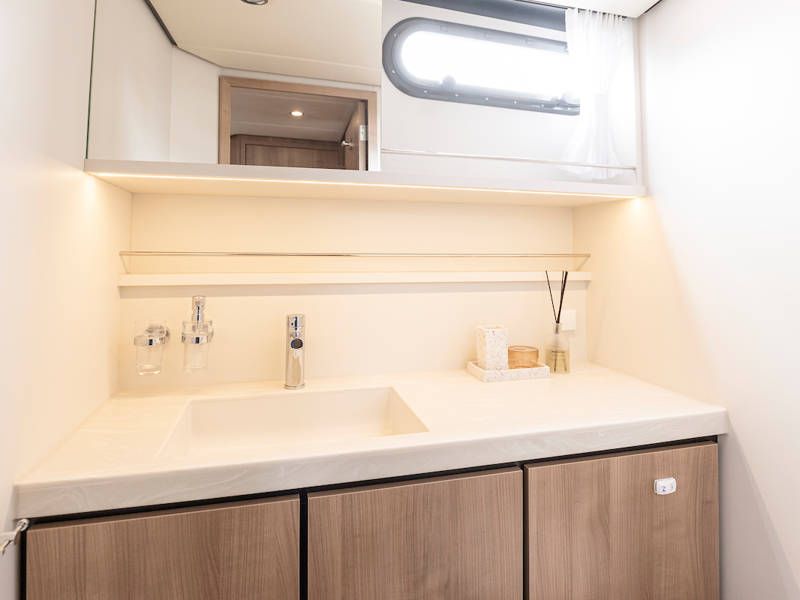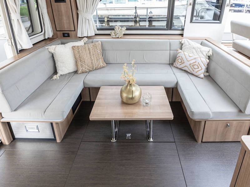 The yacht is laid out with two sleeping cabins, two bathrooms, two electric toilets and one large shower.The saloon has an easy-sleep system, where you can make a double bed in no time.
