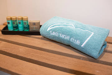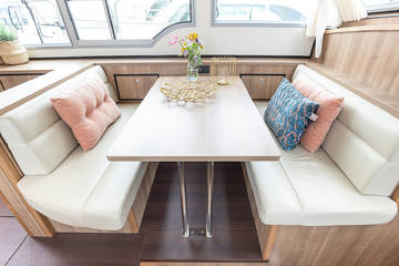 The interior is characterised by a sophisticated layout made of light wood and luxury materials such as Corian tops and leather in a light tasteful colour scheme. Opposite the kitchen is a beautiful dining area (dinette) with plenty of light. A Nespresso machine is available on board.