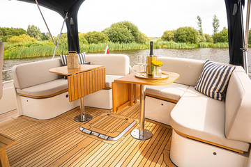 The aft deck is finished in real teak, which gives the yacht its luxurious nautical allure. The adjustable helm seat offers perfect comfort to the skipper.