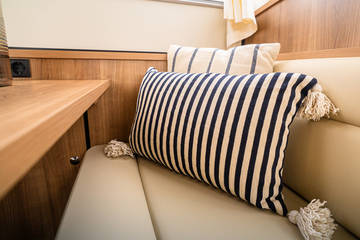 The interior is characterised by a sophisticated layout made from luxurious modern materials such as Corian tops and leather in a light, tasteful colour scheme. Opposite the kitchen is a beautiful dining area (dinette) with lots of light.