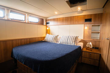 The Linssen Grand Sturdy 40.0 AC is a spacious yacht with two equal-sized cabins, each with a double bed, two bathrooms and two electric toilets.