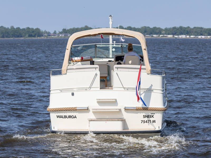 On deck, there is ample seating on the fixed bench with fine cushions and the aft deck can be completely closed off around the bench with an extra-large convertible tent. The aft deck can be heated, so you can sit outside comfortably until late in the evening.