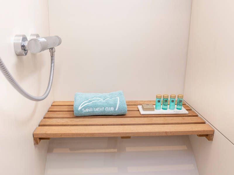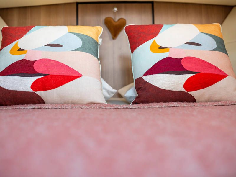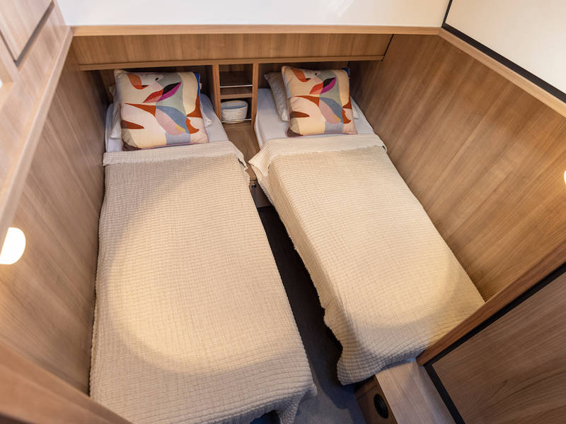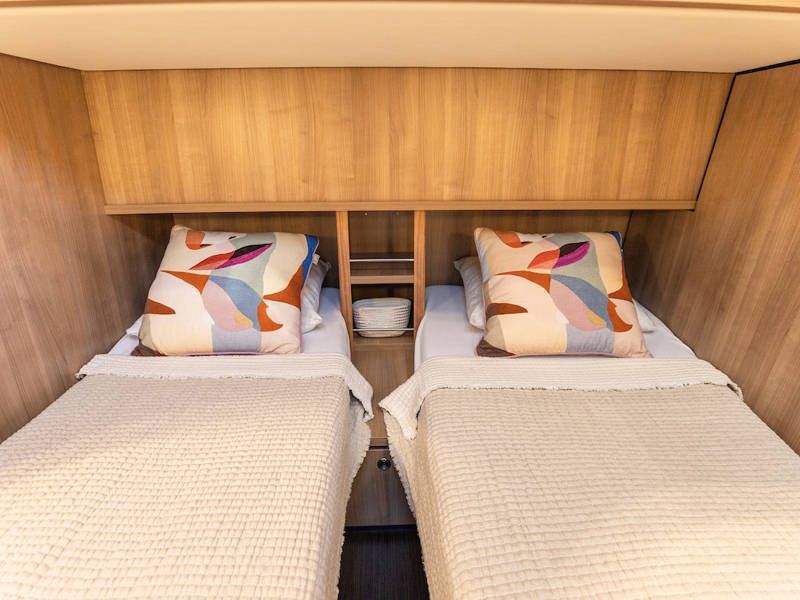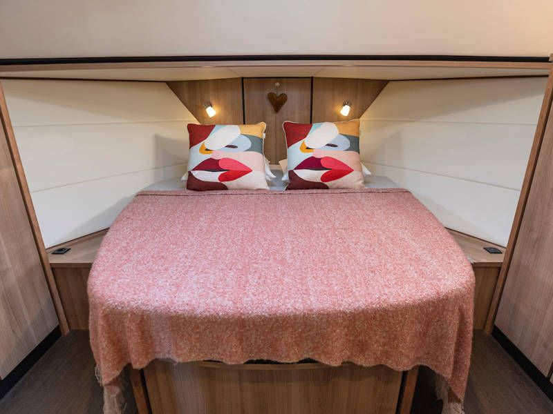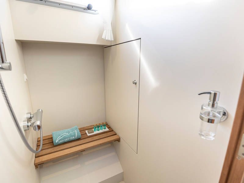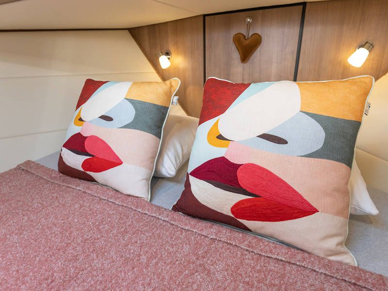 The boat is equipped with two sleeping cabins. One cabin has a free-standing double bed and the other cabin has 2 single beds. There is also a spacious bathroom and a toilet.