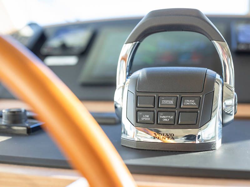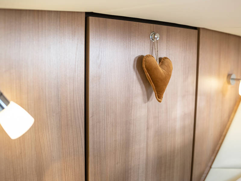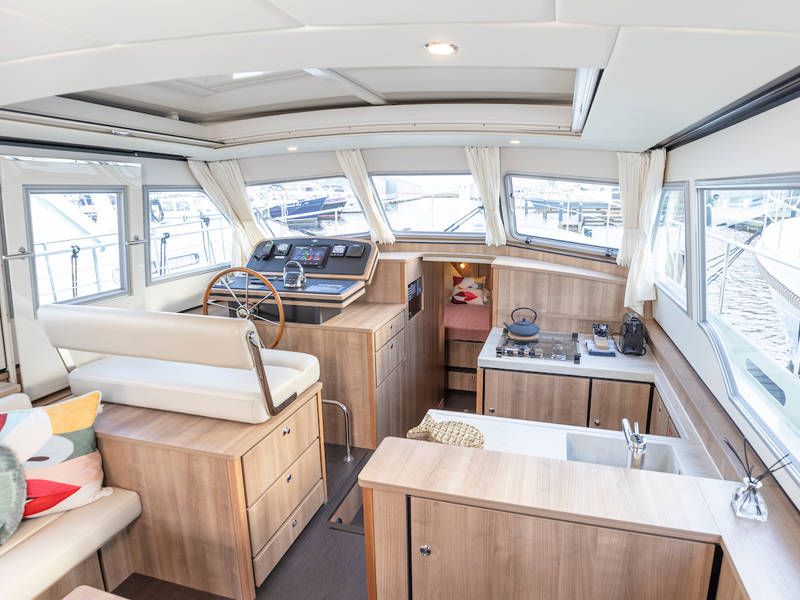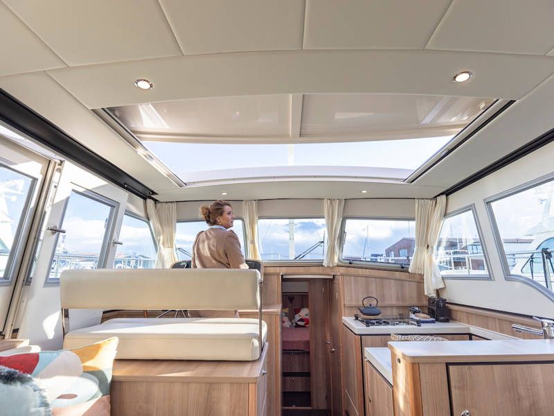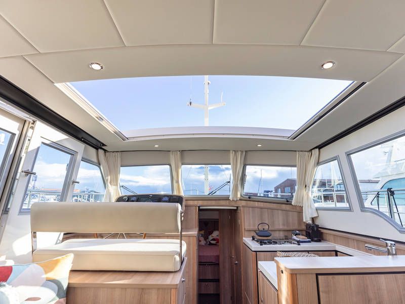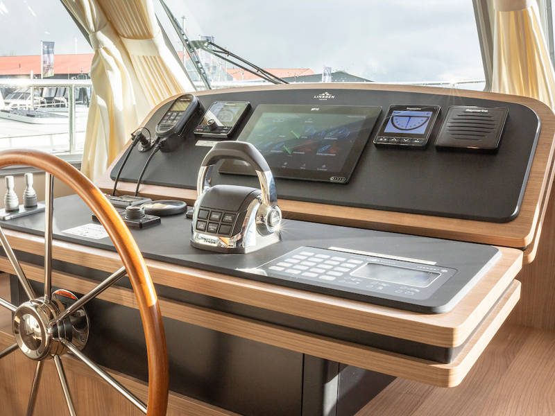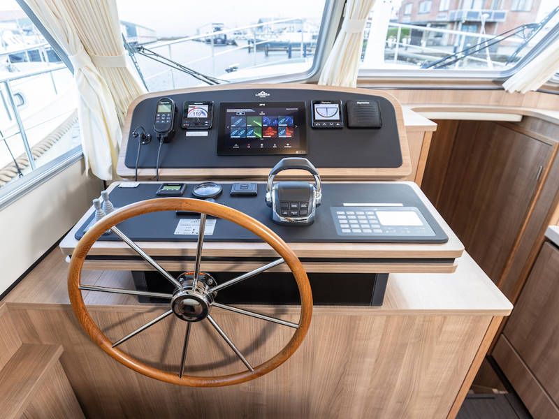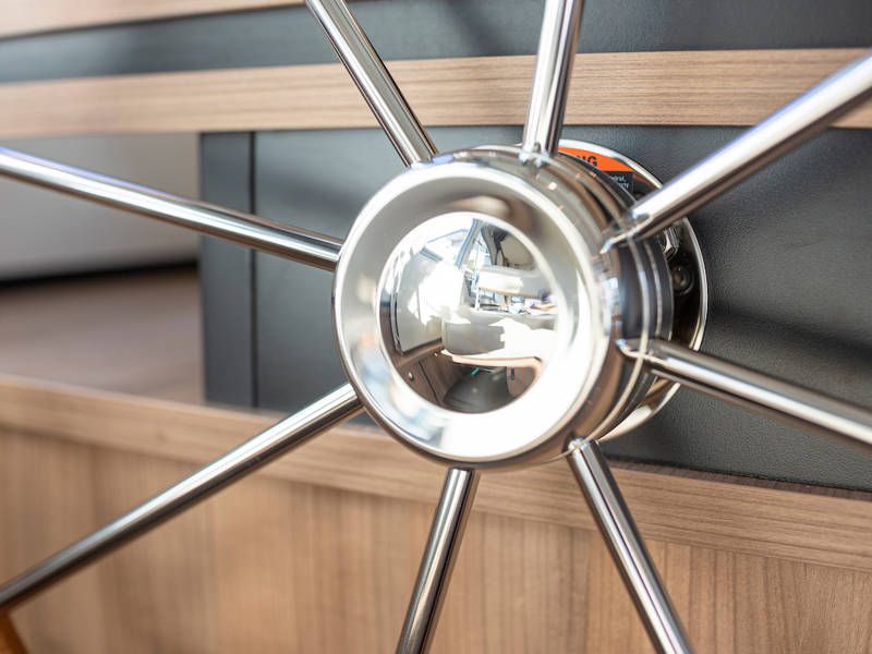 The helm position is equipped with a very complete navigation package, a two-person steering bench and a sliding door on port side. Also a full-roof sliding roof, which gives the free feeling that you are sitting outside.