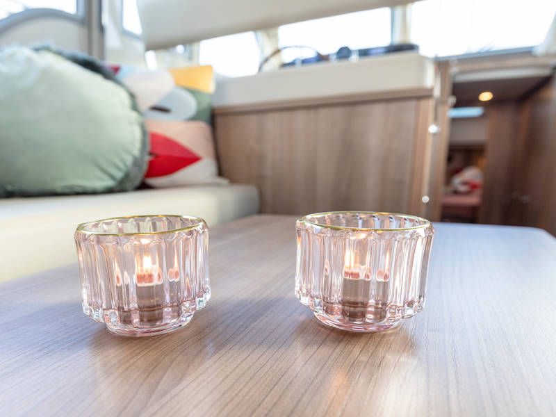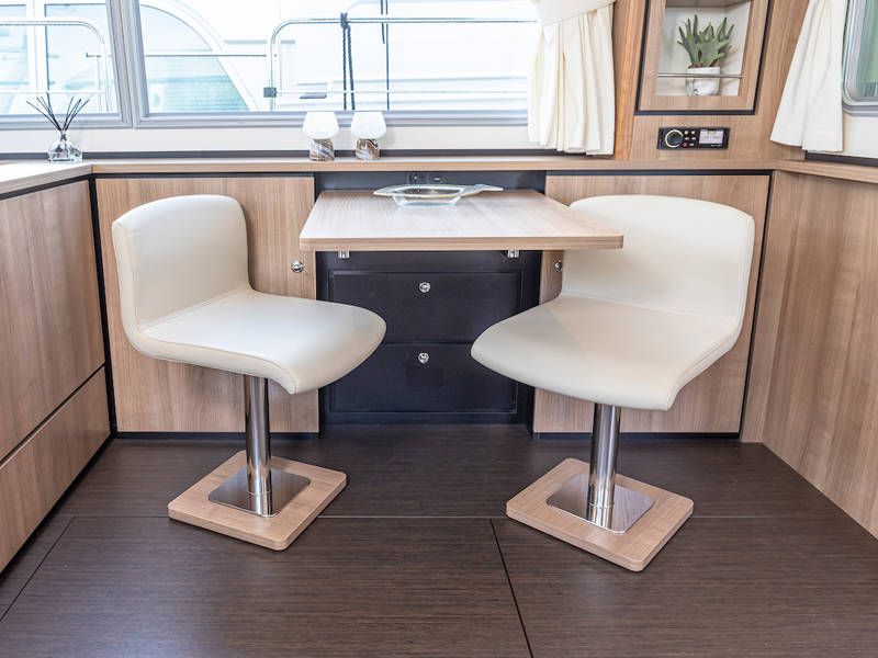 In the cockpit is a nice spacious sofa and a dining table. The open cockpit has a continuous long-top with atmospheric lighting. The cockpit can be completely closed to an extension of the salon.
