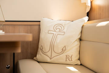The saloon is spacious and bright, offering a pleasant living area on board. Opposite the dining area is a generous kitchen, fully equipped with all necessary appliances, including an electric hob, refrigerator and oven. A Nespresso coffee machine is, of course, also available.