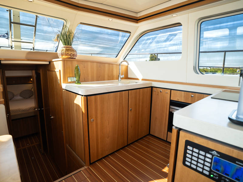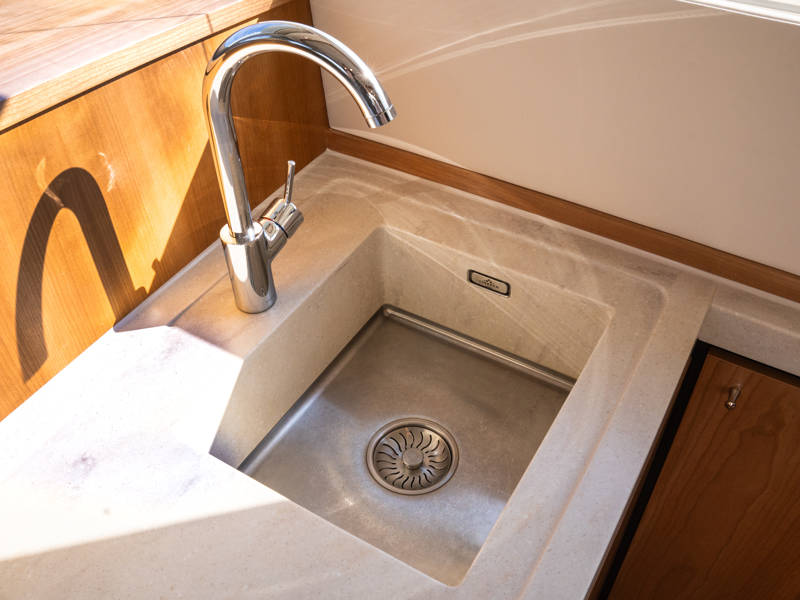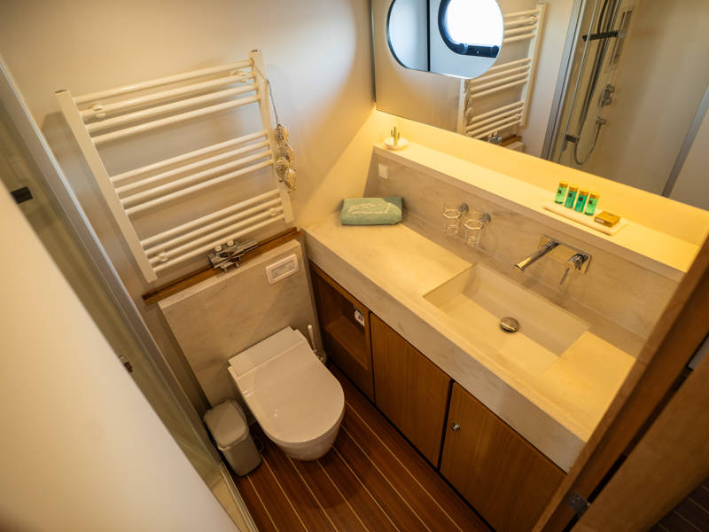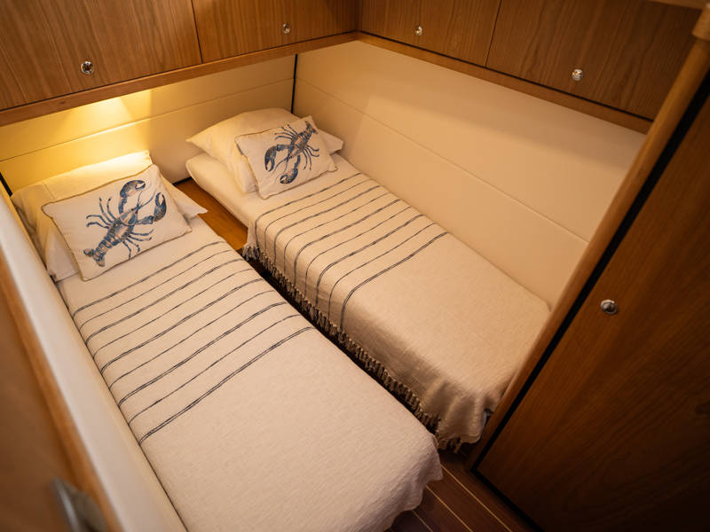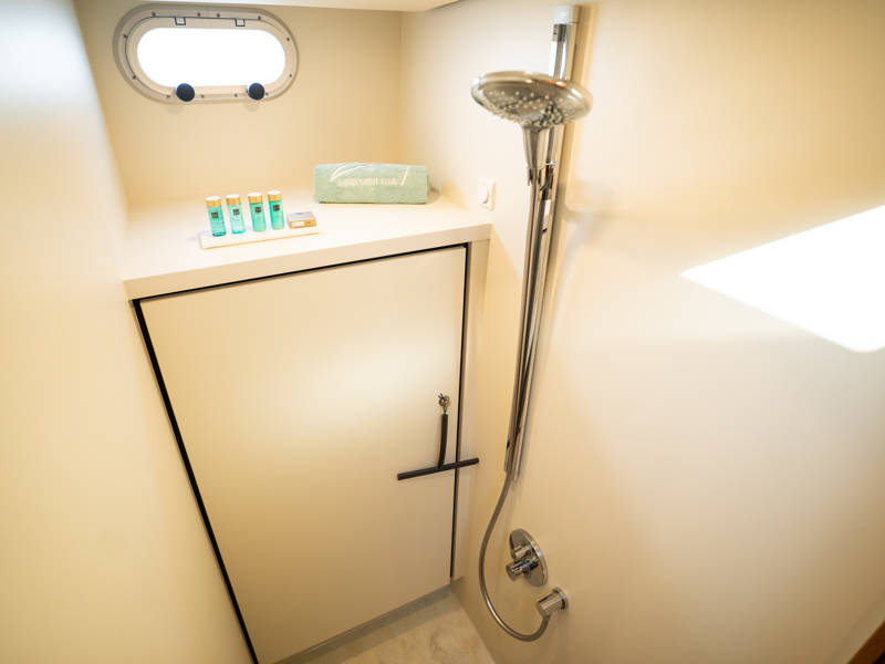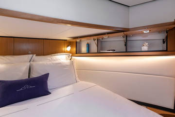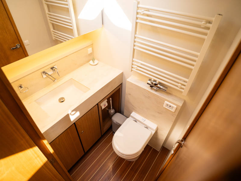 Below deck are two spacious 2-person sleeping cabins, two bathrooms and two toilets. And an extra third cabin with 2 single beds. A fully equipped kitchen, with combi-oven, dishwasher, induction cooker and an integrated luxury espresso machine complete the luxury experience. The Blue Sky is equipped with an air conditioning system.