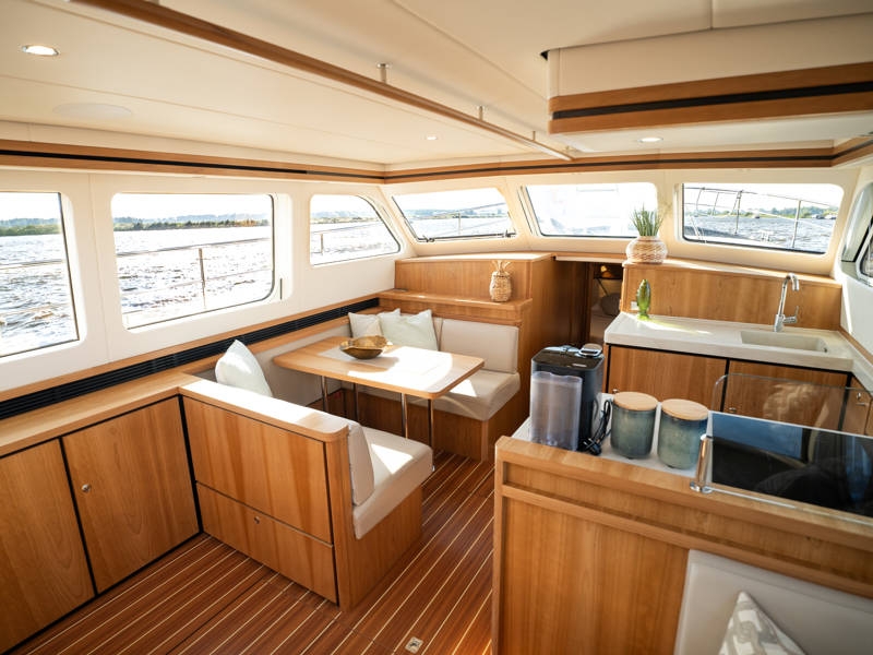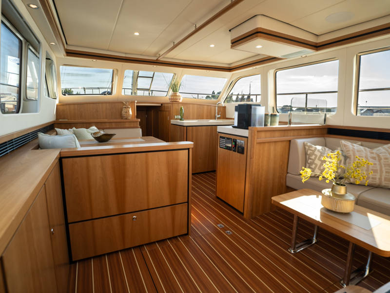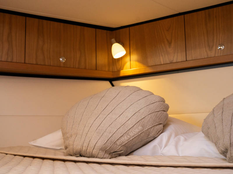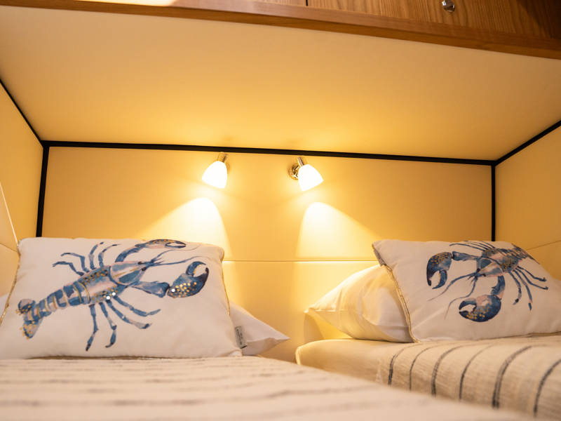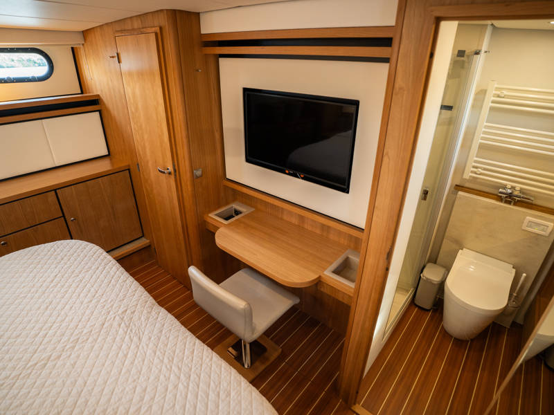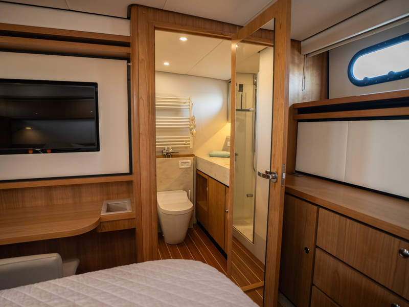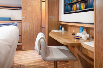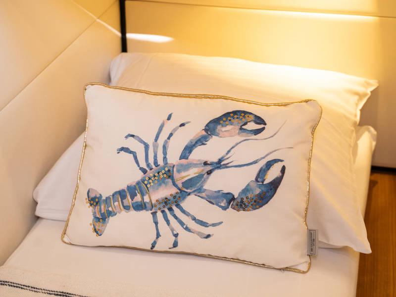 Below deck are two spacious 2-person sleeping cabins, two bathrooms and two toilets. And an extra third cabin with 2 single beds. A fully equipped kitchen, with combi-oven, dishwasher, induction cooker and an integrated luxury espresso machine complete the luxury experience. The Blue Sky is equipped with an air conditioning system.