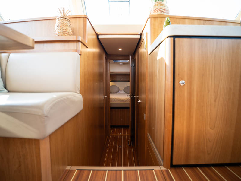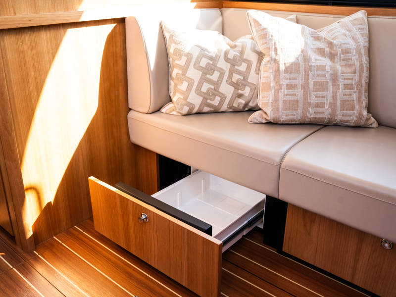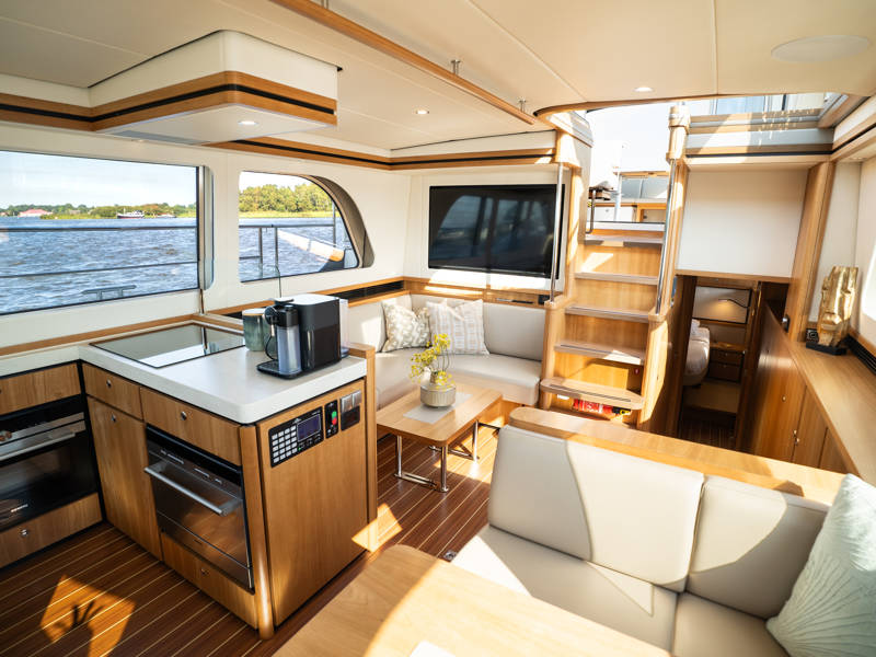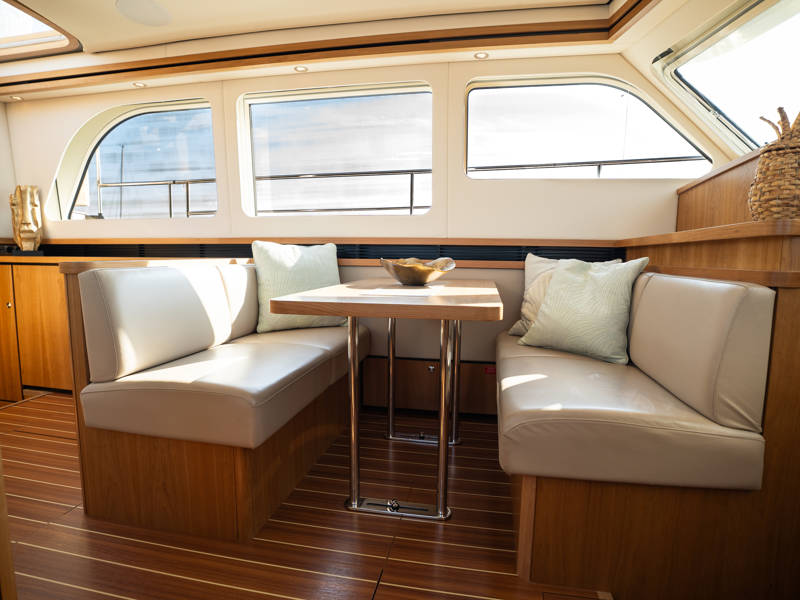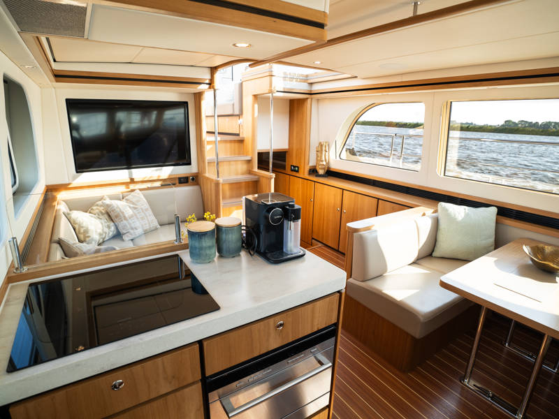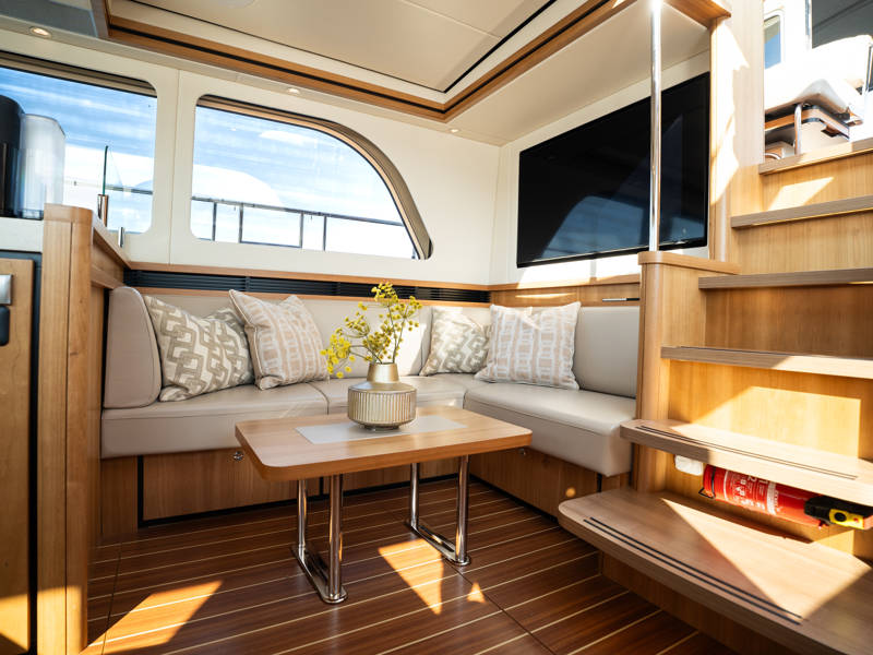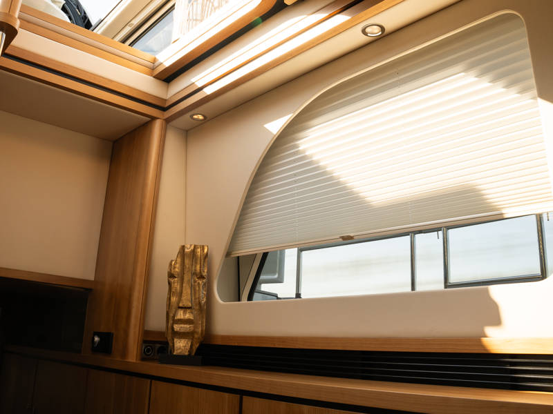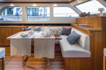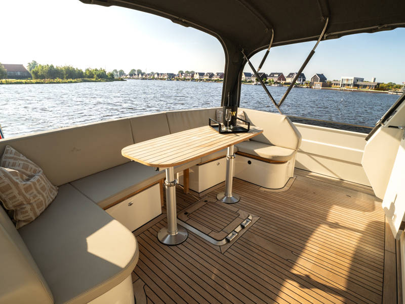 The Variotop, which is electrically operated, is located above the steering bench. There is plenty of seating in the wheelhouse and also a small kitchen with an extra refrigerator. This part of the boat can be completely closed off with solid doors and can be heated. Furthermore, on the afterdeck there is a spacious seating area with a height-adjustable table. This part, the aft deck, can also be completely closed off with a convertible top (not shown in the photos).