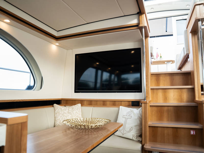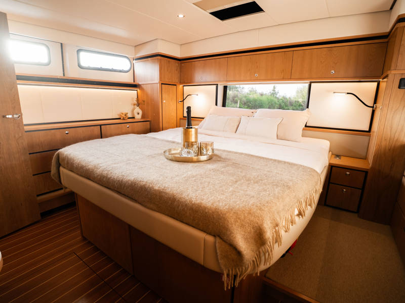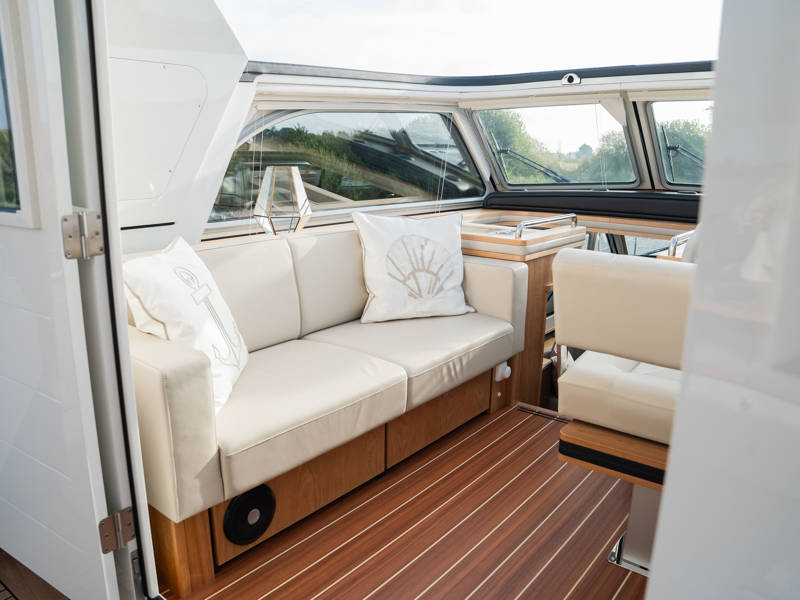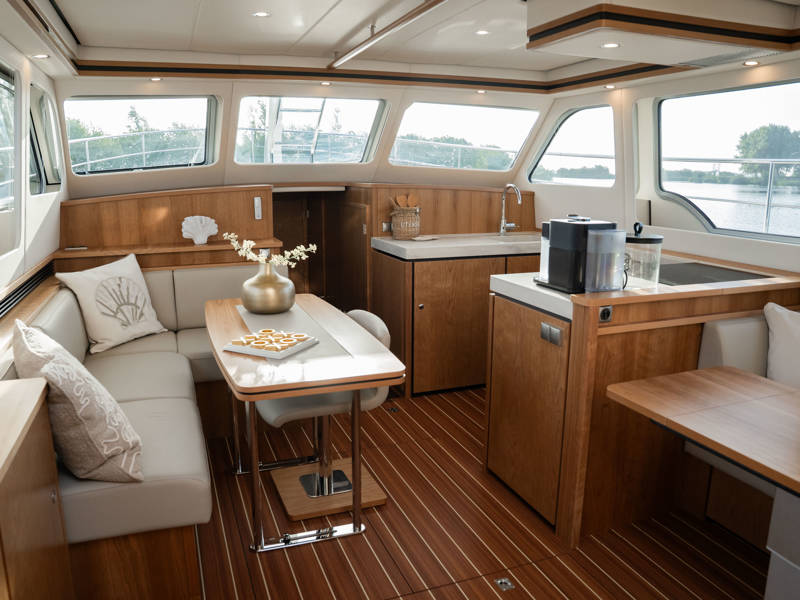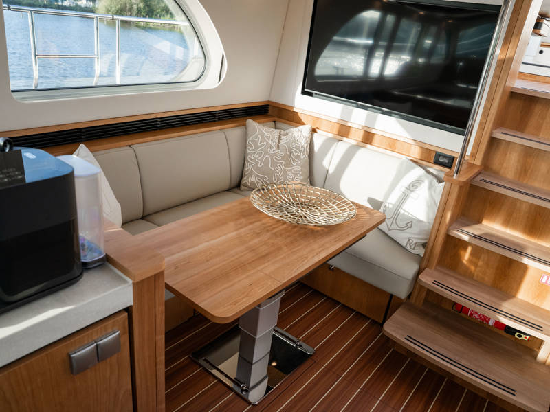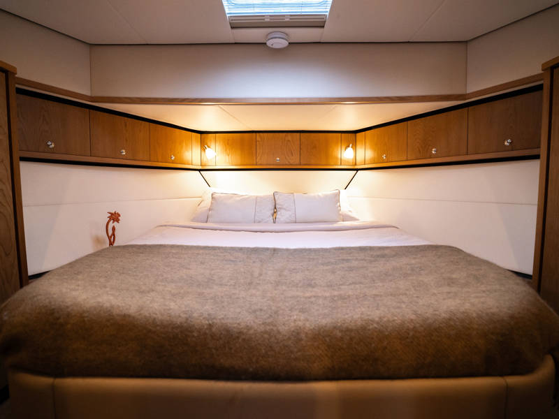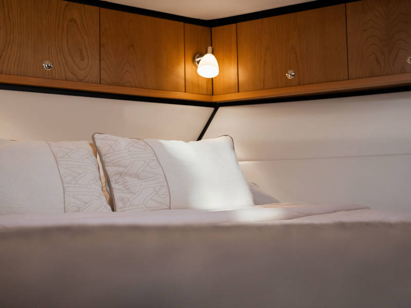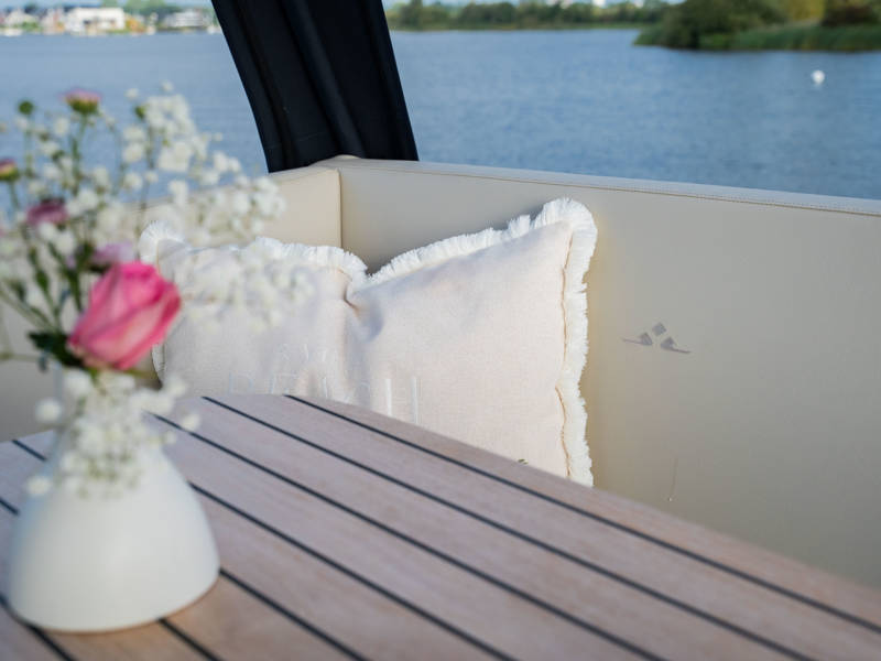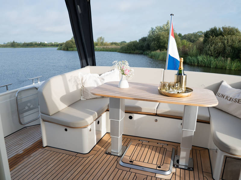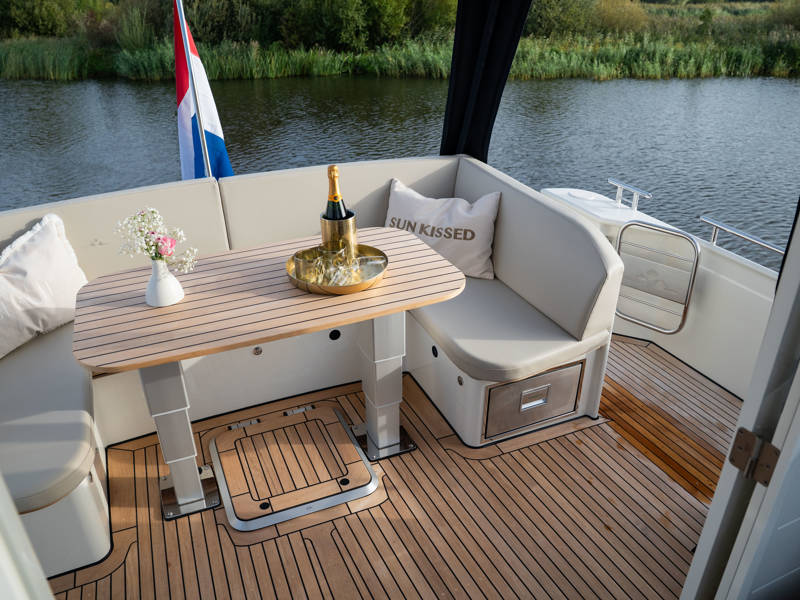 The wheelhouse boasts an electrically adjustable double helm seat and a second bench – a cozy spot for guests to relax while cruising. When opened, the door system connects the wheelhouse seamlessly to the aft deck, creating a spacious, sociable area. Above the aft deck is our newest innovation: a fixed long-top with dimmable lighting and infrared panels for warm, atmospheric evenings on deck, even when temperatures drop. The aft deck also features a flexible seating area easily converted into a lounge bed.