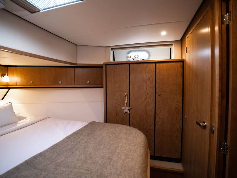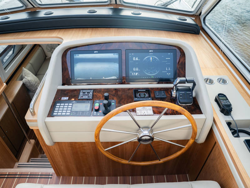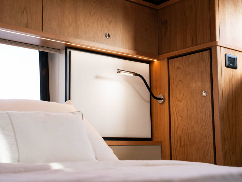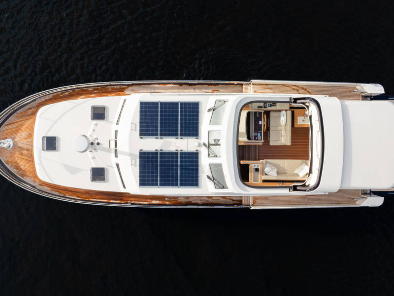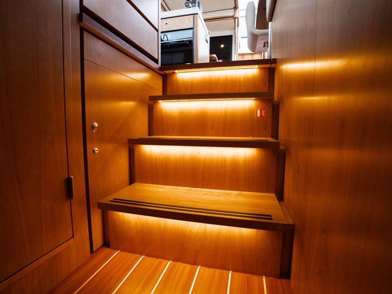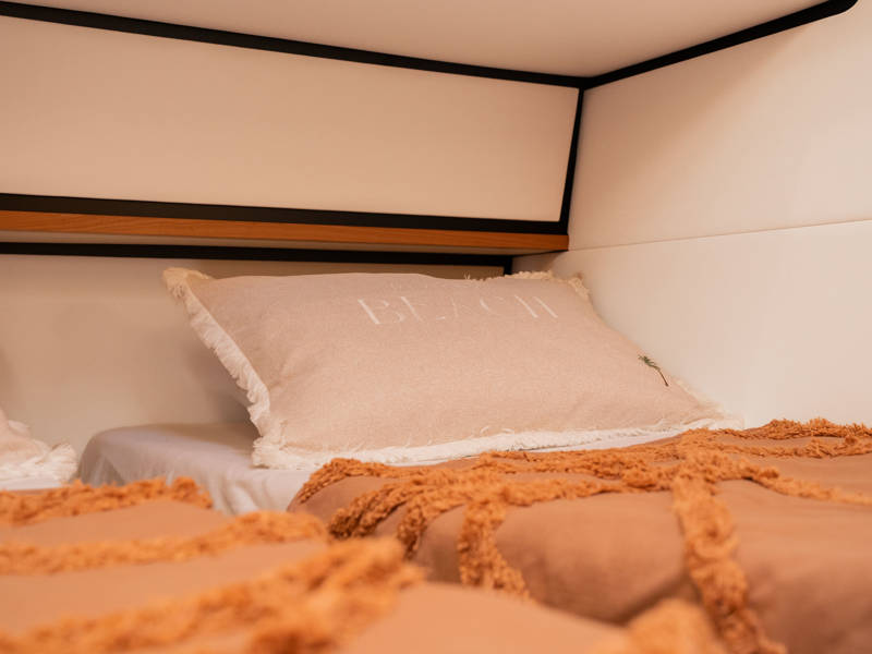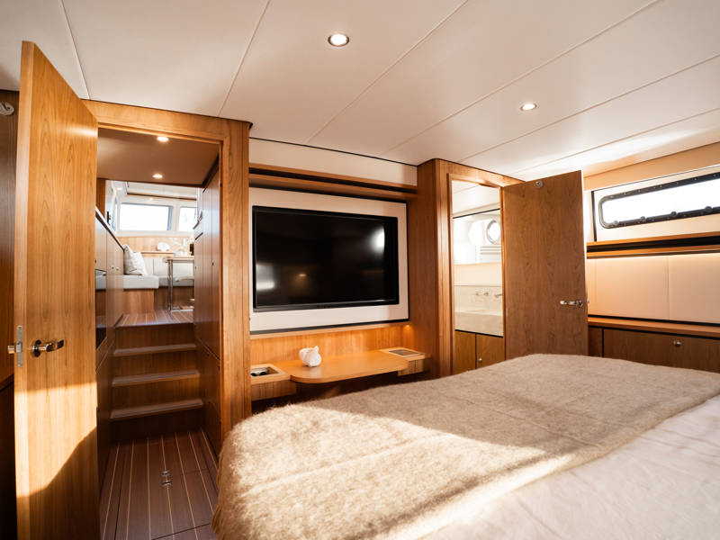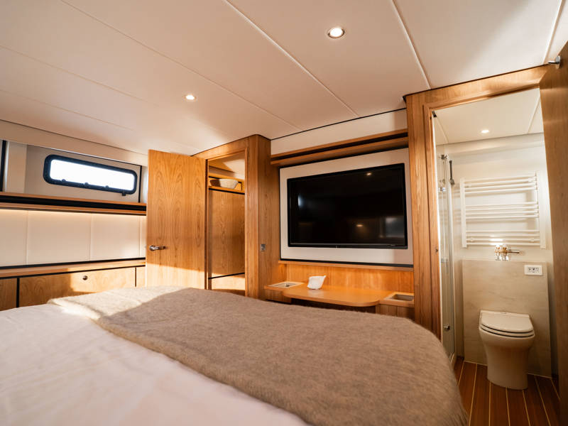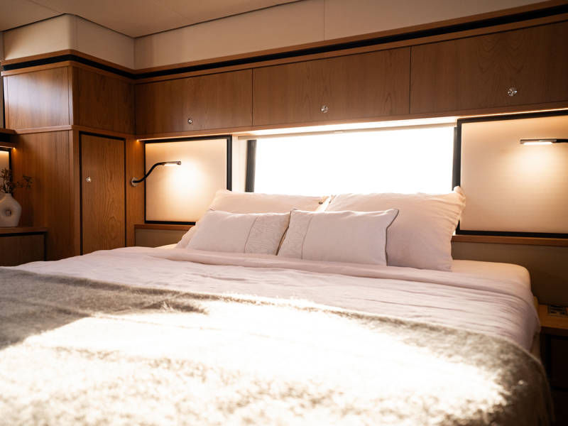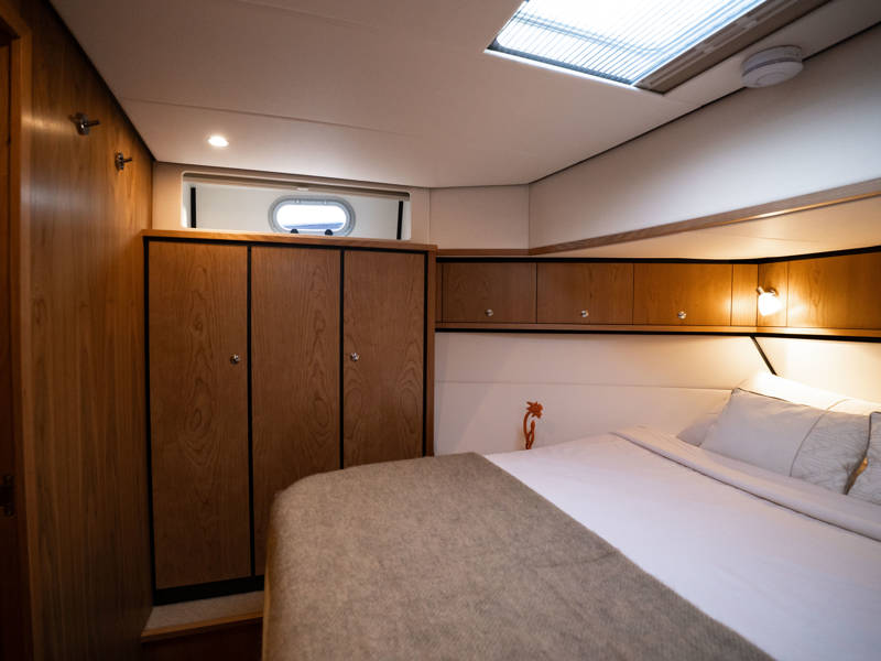The wheelhouse boasts an electrically adjustable double helm seat and a second bench – a cozy spot for guests to relax while cruising. When opened, the door system connects the wheelhouse seamlessly to the aft deck, creating a spacious, sociable area. Above the aft deck is our newest innovation: a fixed long-top with dimmable lighting and infrared panels for warm, atmospheric evenings on deck, even when temperatures drop. The aft deck also features a flexible seating area easily converted into a lounge bed.