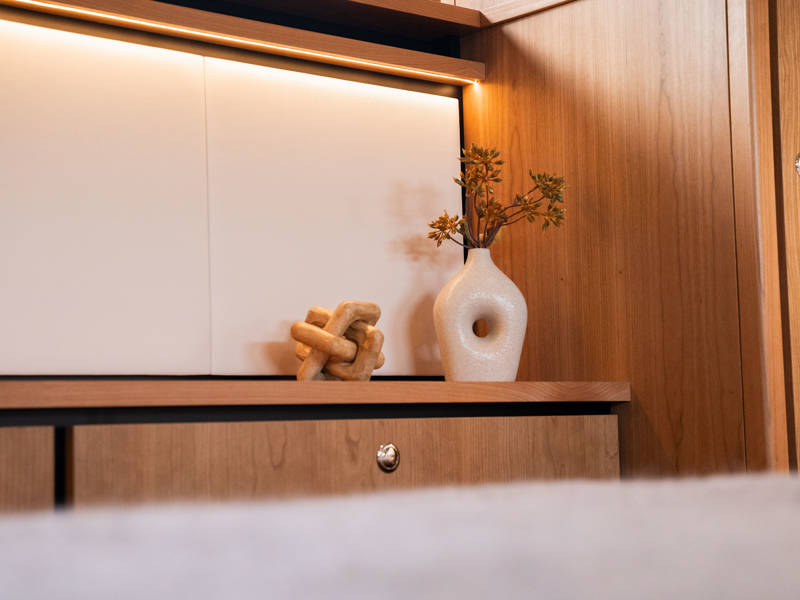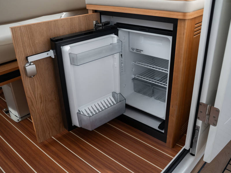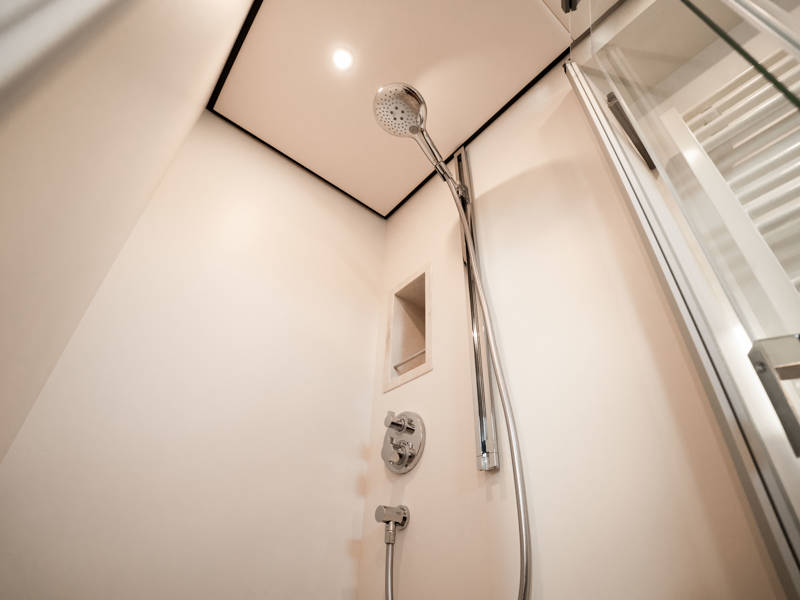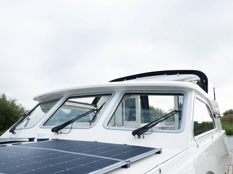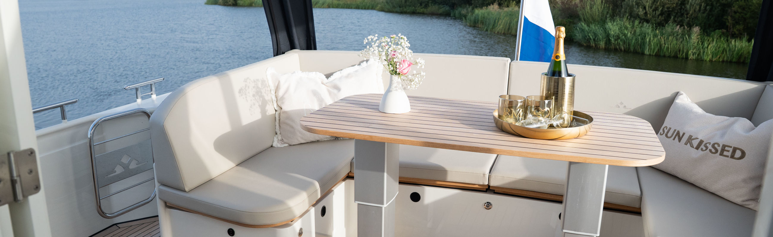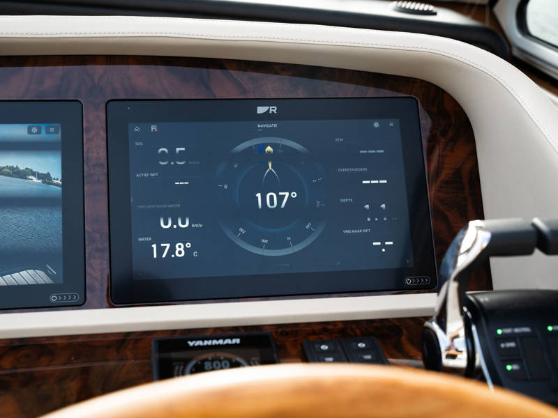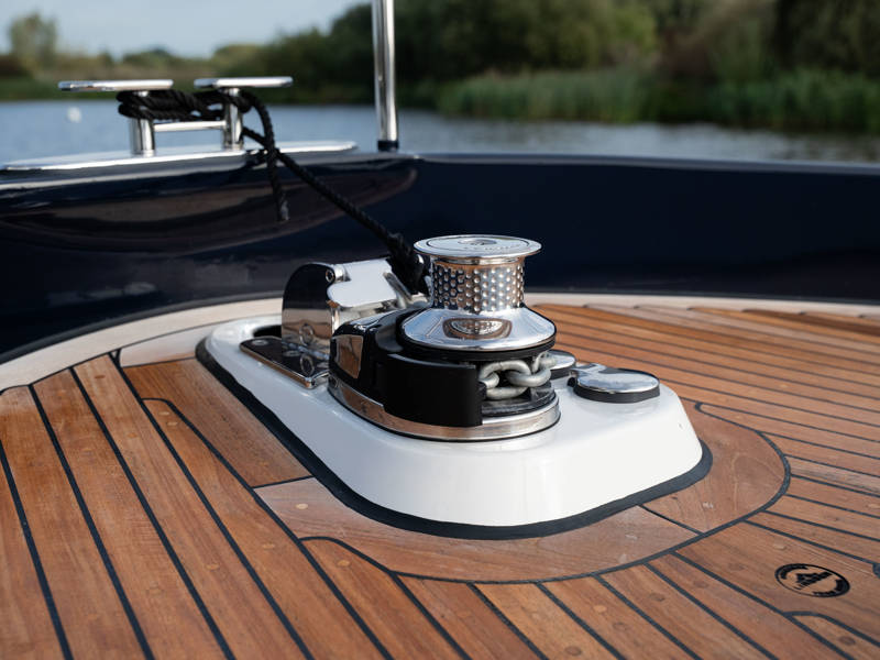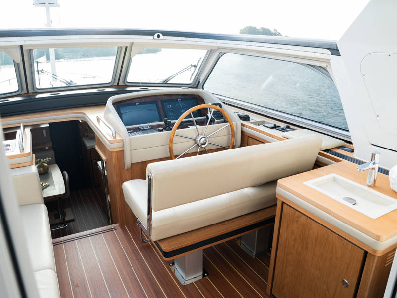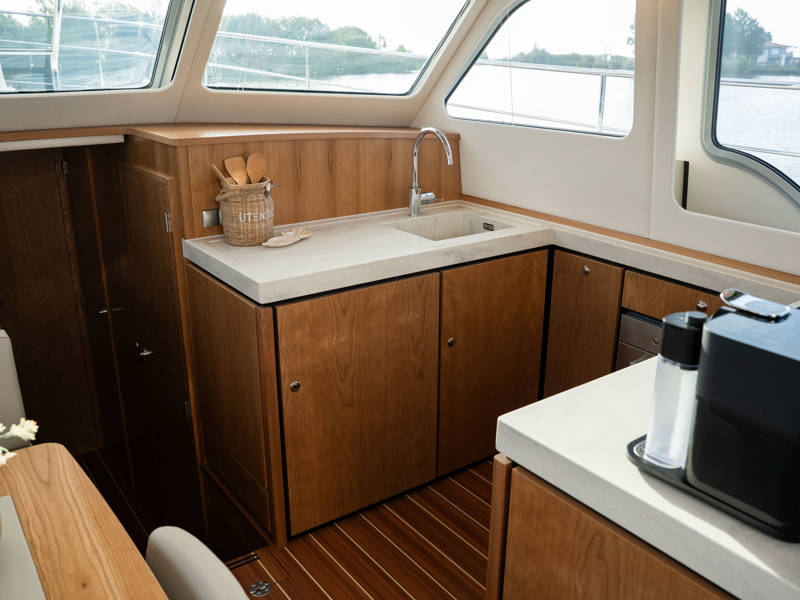 The wheelhouse boasts an electrically adjustable double helm seat and a second bench – a cozy spot for guests to relax while cruising. When opened, the door system connects the wheelhouse seamlessly to the aft deck, creating a spacious, sociable area. Above the aft deck is our newest innovation: a fixed long-top with dimmable lighting and infrared panels for warm, atmospheric evenings on deck, even when temperatures drop. The aft deck also features a flexible seating area easily converted into a lounge bed.