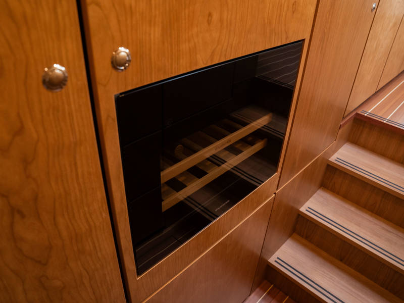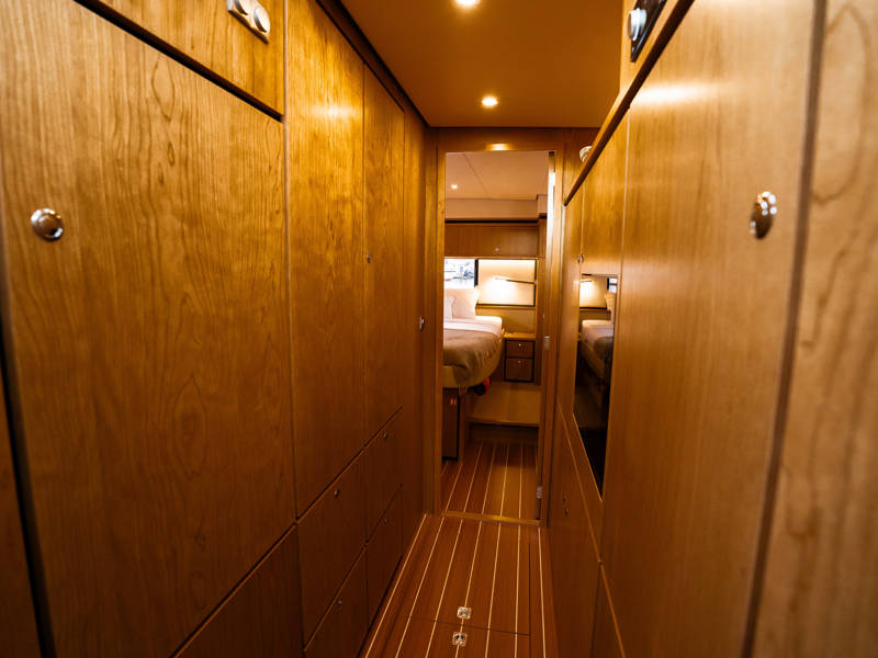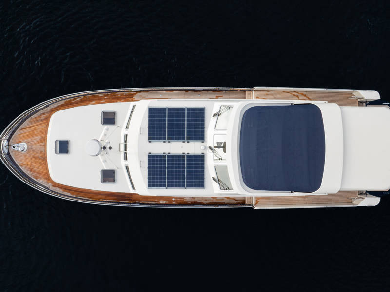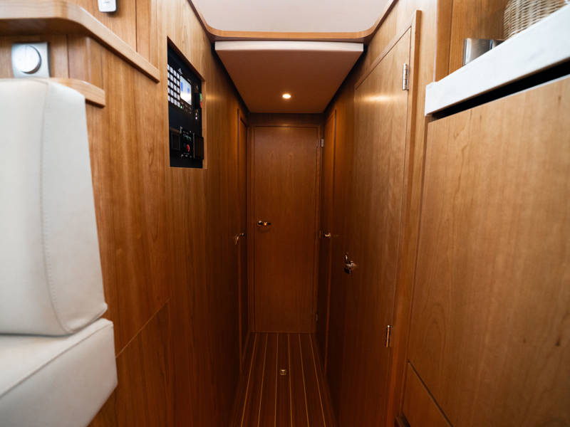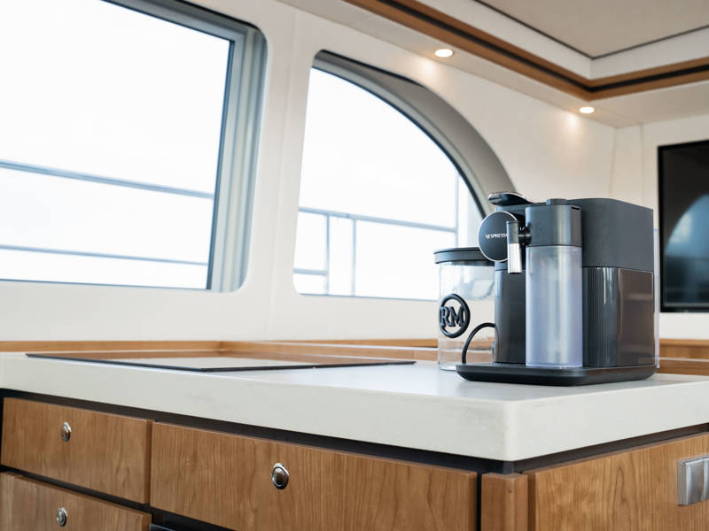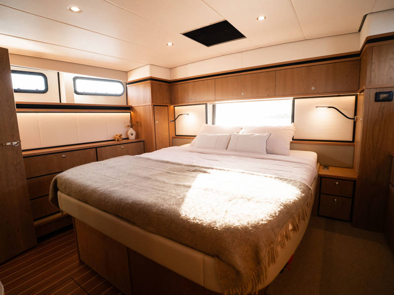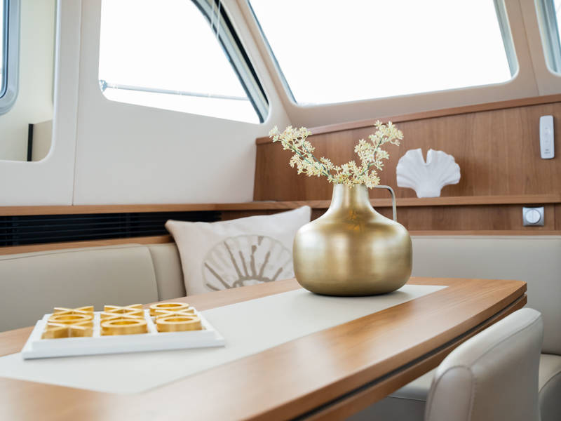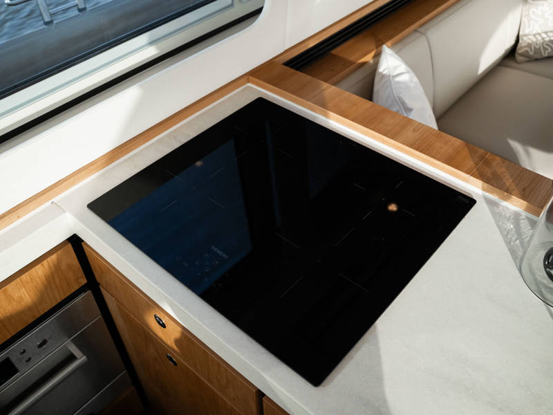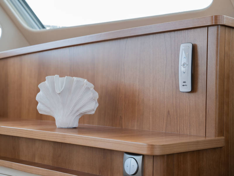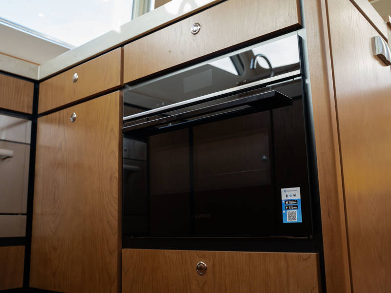 The Matisse includes a state-of-the-art galley with combi-oven, dishwasher, and induction cooktop, as well as a high-performance generator and air conditioning throughout. The elegant pleated blinds in the saloon and wheelhouse are electrically controlled for added comfort and style.