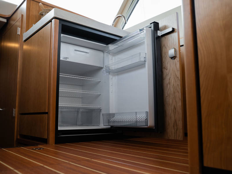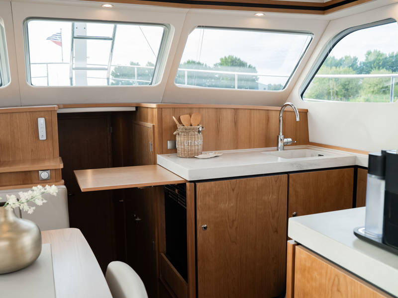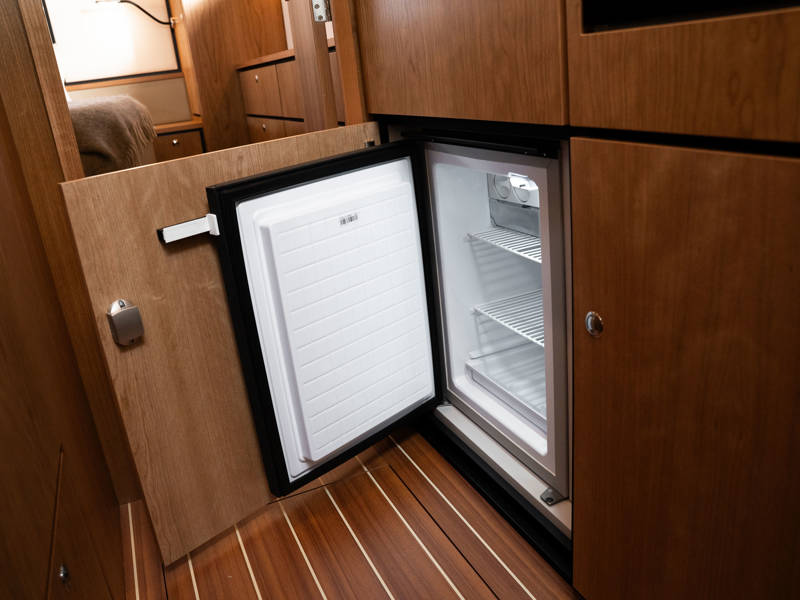 Below deck, the master suite in the aft cabin offers a freestanding double bed, a private toilet with washbasin to starboard, and a separate shower room. The saloon includes a spacious L-shaped sofa and a fully equipped galley. On the port side, you’ll find a dinette and additional cabinetry.