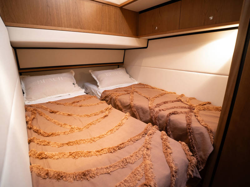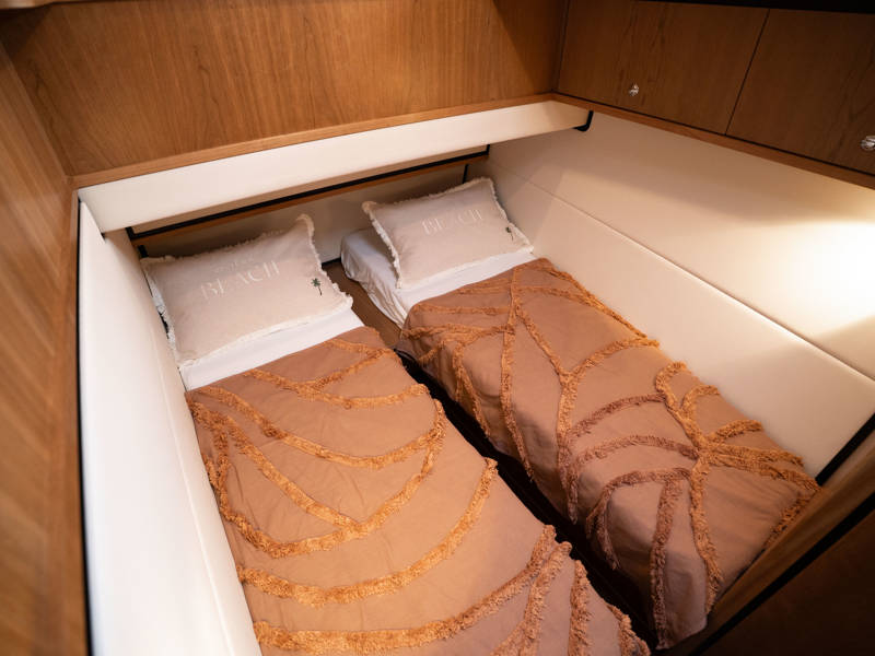In the bow, there's a second cabin with a double bed and wardrobes, a private bathroom with an electric toilet and vanity, and a separate shower room with a built-in washer-dryer unit. The guest cabin offers two single beds, one of which can slide together to form a double.